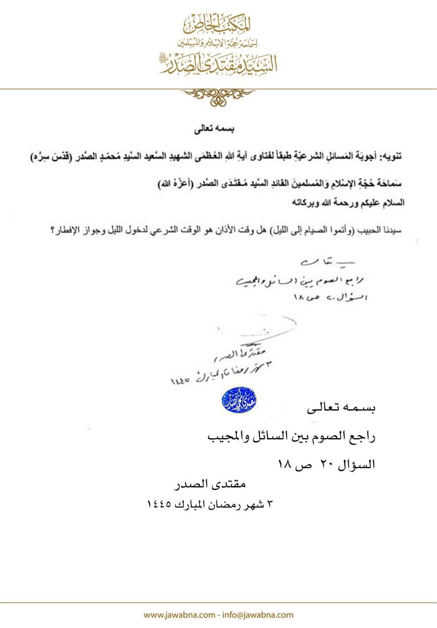 سماحة القائد السيد مقتدى الصدر (أعزه الله) يجيب على سؤال قدم لسماحته حول الوقت الشرعي لدخول الليل وجواز الافطار 15/03/2024 16:28:00 عدد القراءات : 358 المكتب الخاص النجف الأشرف