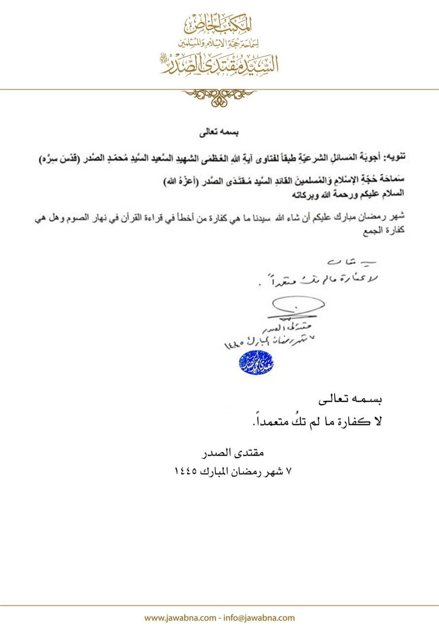 سماحة القائد السيد مقتدى الصدر (أعزه الله) يجيب على سؤال قدم لسماحته حول كفارة من أخطأ في قراءة القرآن في نهار الصوم 19/03/2024 15:15:00 عدد القراءات : 1422 المكتب الخاص/ النجف الاشرف