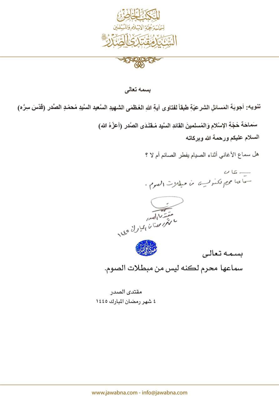 سماحة القائد السيد مقتدى الصدر (أعزه الله) يجيب على سؤال قدم لسماحته حول سماع الأغاني أثناء الصيام 20/03/2024 14:20:00 عدد القراءات : 1707 المكتب الخاص/ النجف الاشرف