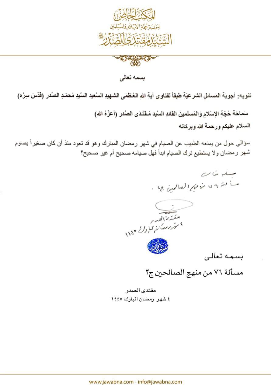سماحة القائد السيد مقتدى الصدر (أعزه الله) يجيب على سؤال قدم لسماحته حول من يمنعه الطبيب عن الصيام 20/03/2024 14:22:00 عدد القراءات : 1627 المكتب الخاص/ النجف الاشرف
