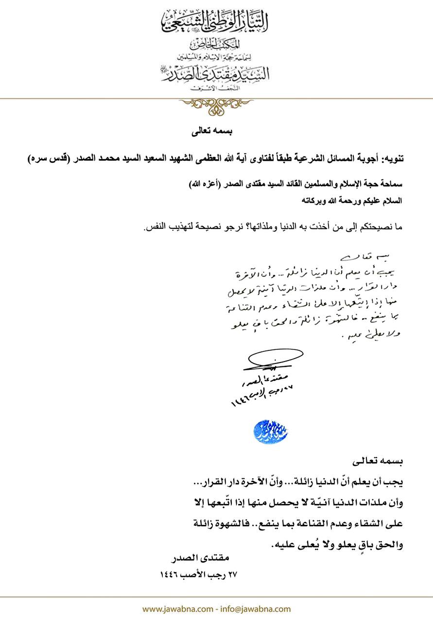 سماحة القائد السيد مقتدى الصدر (أعزه الله) يجيب على سؤال قدم لسماحته حول نصيحة لتهذيب النفس 26/04/2025 14:58:00 عدد القراءات : 303 المكتب الخاص/ النجف الأشرف