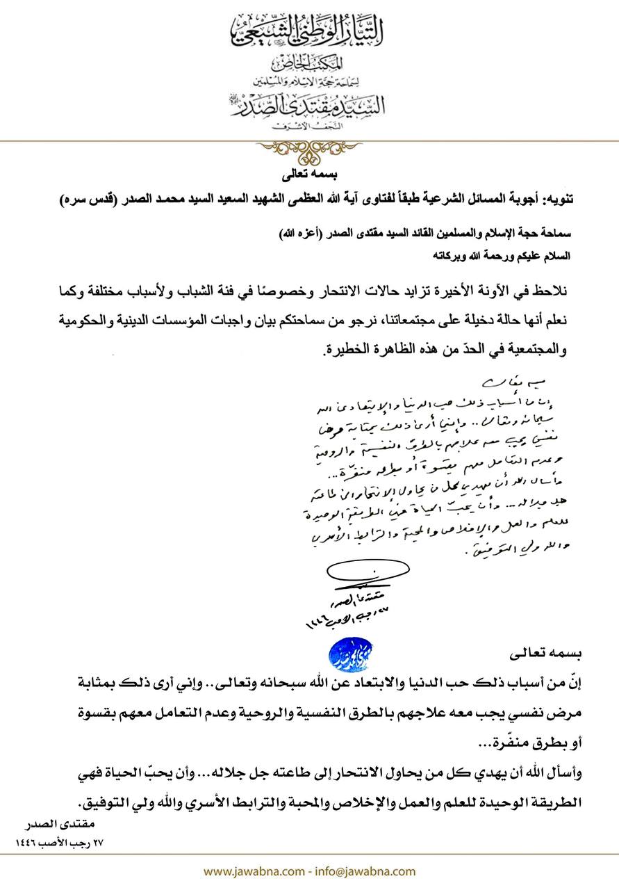 سماحة القائد السيد مقتدى الصدر (أعزه الله) يجيب على سؤال قدم لسماحته حول تزايد حالات الانتحار وخصوصا في فئة الشباب 26/04/2025 14:59:00 عدد القراءات : 150 المكتب الخاص/ النجف الأشرف