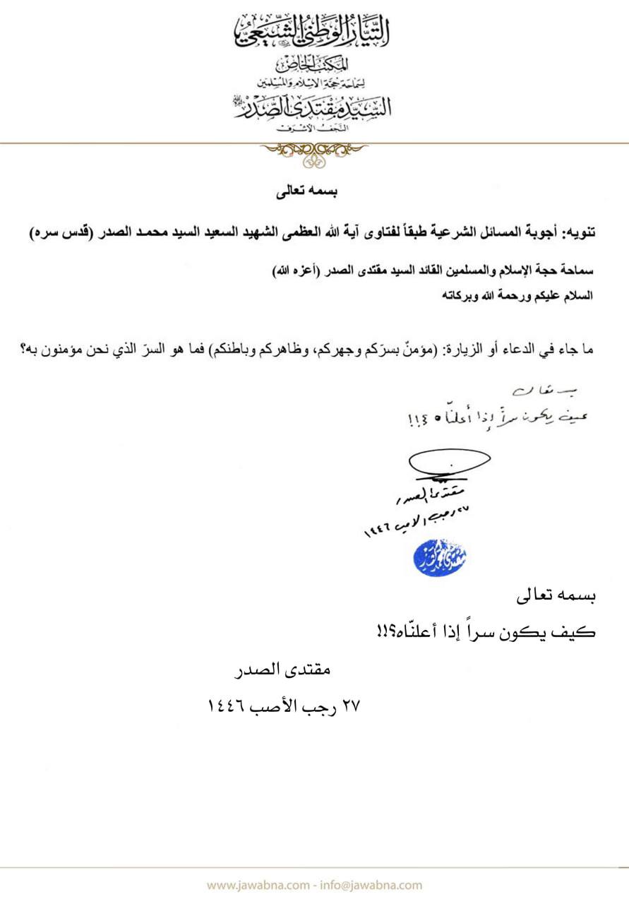 سماحة القائد السيد مقتدى الصدر (أعزه الله) يجيب على سؤال قدم لسماحته حول كلمة السر بـ (مؤمن بسركم وجهركم) 26/04/2025 15:09:00 عدد القراءات : 214 المكتب الخاص/ النجف الأشرف