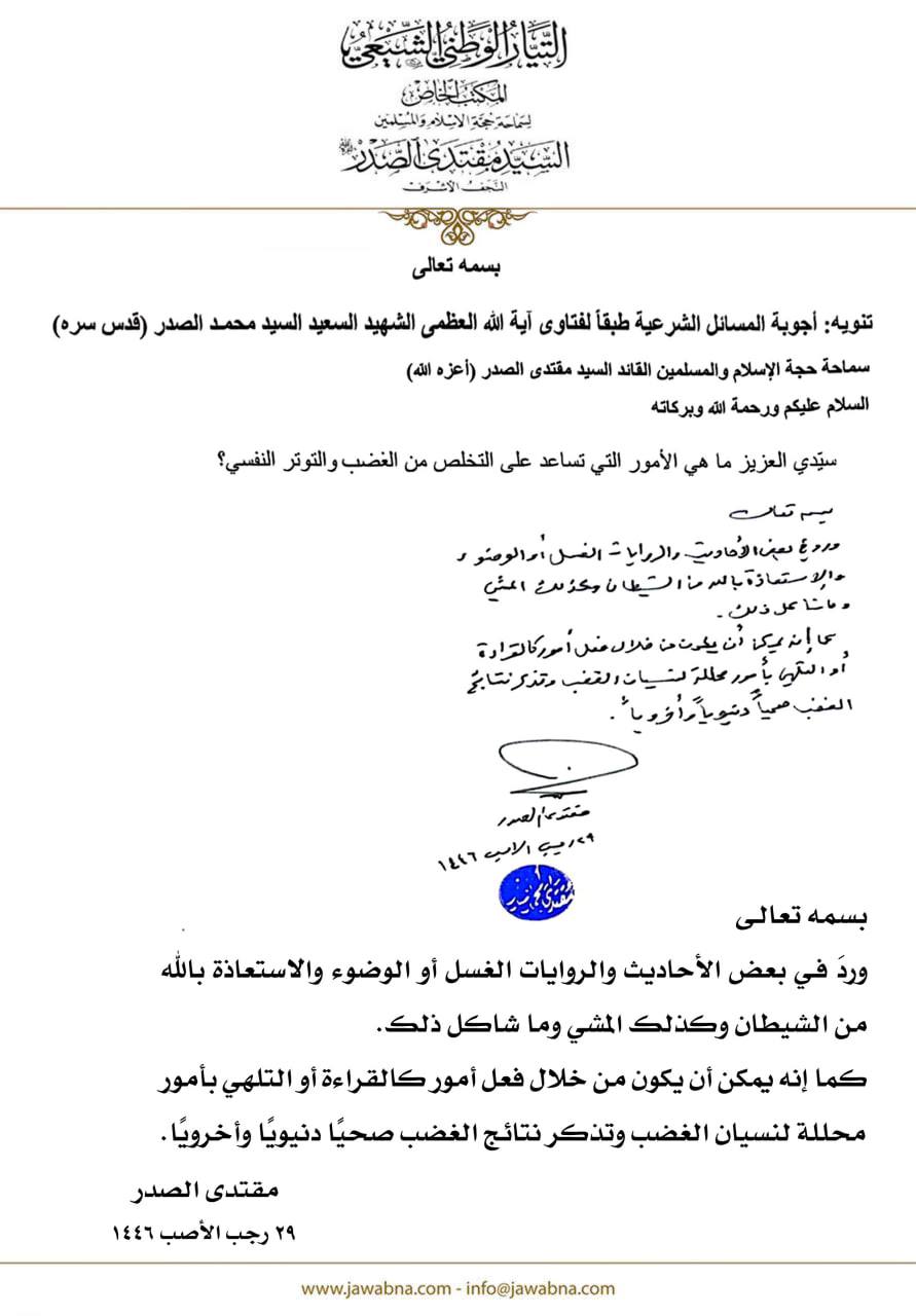 سماحة القائد السيد مقتدى الصدر (أعزه الله) يجيب على سؤال قدم لسماحته حول الأمور التي تساعد على التخلص من الغضب والتوتر النفسي