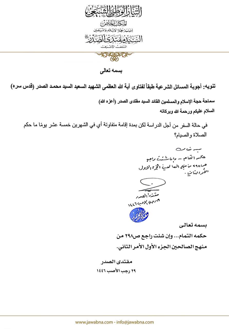 سماحة القائد السيد مقتدى الصدر (أعزه الله) يجيب على سؤال قدم لسماحته حول الصيام والصلاة في حالة السفر من اجل الدراسة 26/04/2025 15:28:00 عدد القراءات : 248 المكتب الخاص/ النجف الأشرف