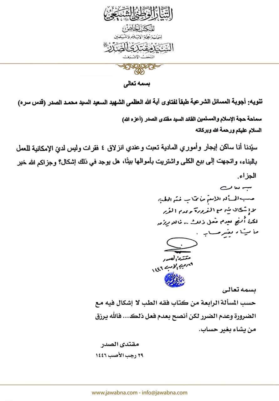 سماحة القائد السيد مقتدى الصدر (أعزه الله) يجيب على سؤال قدم لسماحته حول بيع الكلى من اجل شراء بيت 26/04/2025 15:30:00 عدد القراءات : 371 المكتب الخاص/ النجف الأشرف