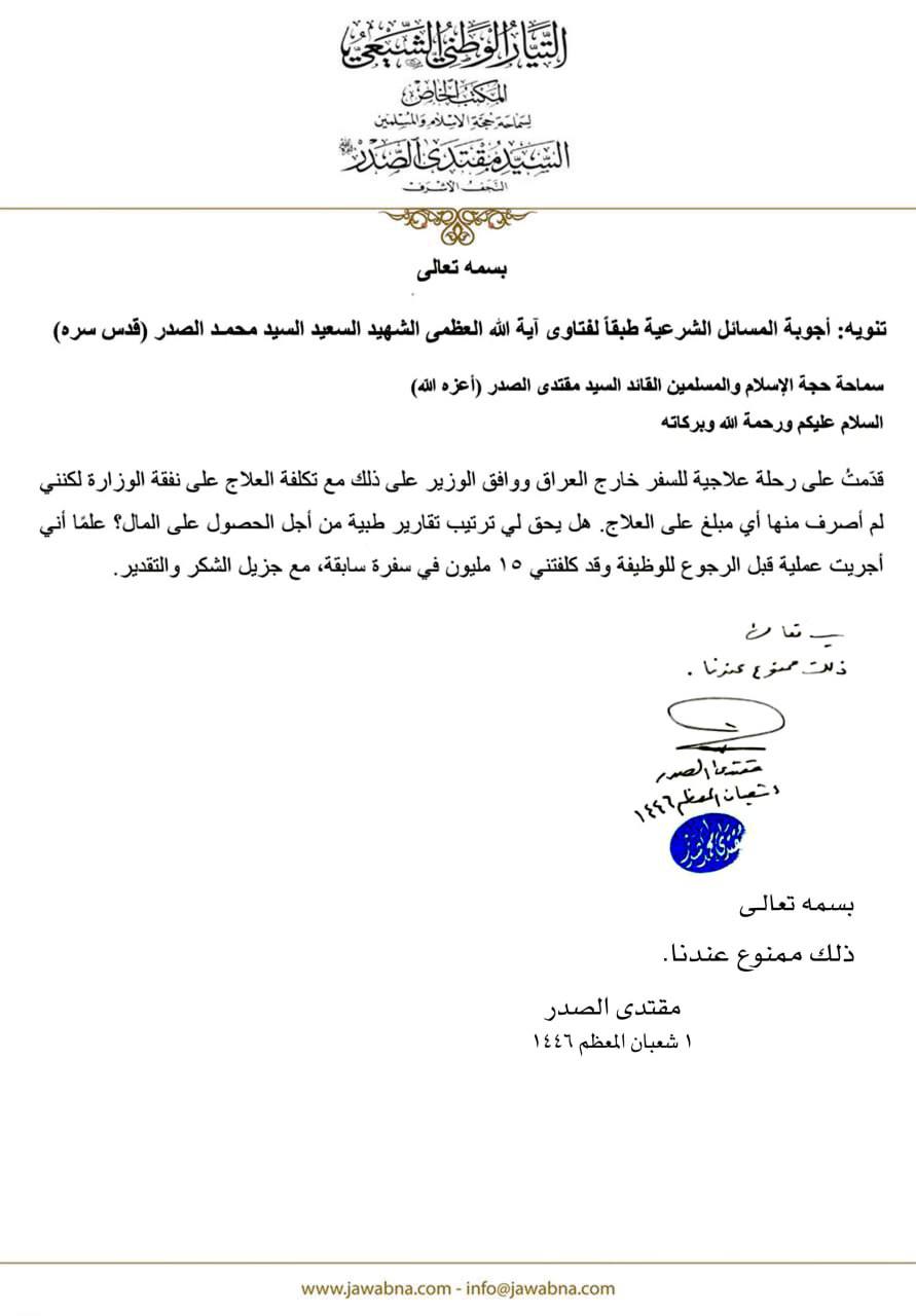 سماحة القائد السيد مقتدى الصدر (أعزه الله) يجيب على سؤال قدم لسماحته حول ترتيب تقارير طبية من أجل الحصول على المال 26/04/2025 15:38:00 عدد القراءات : 209 المكتب الخاص/ النجف الأشرف