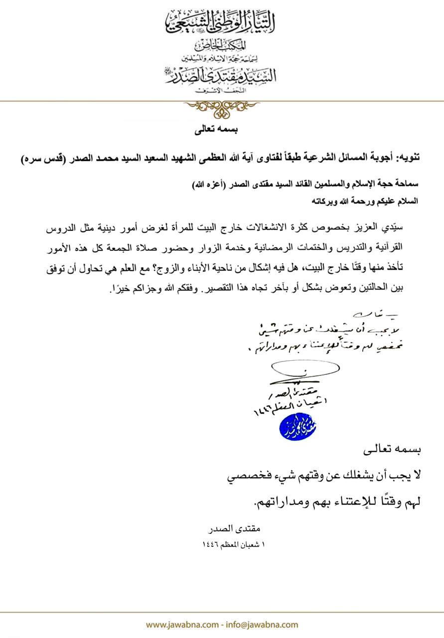 سماحة القائد السيد مقتدى الصدر (أعزه الله) يجيب على سؤال قدم لسماحته حول كثرة الانشغالات خارج البيت للمرأة لأمور دينية