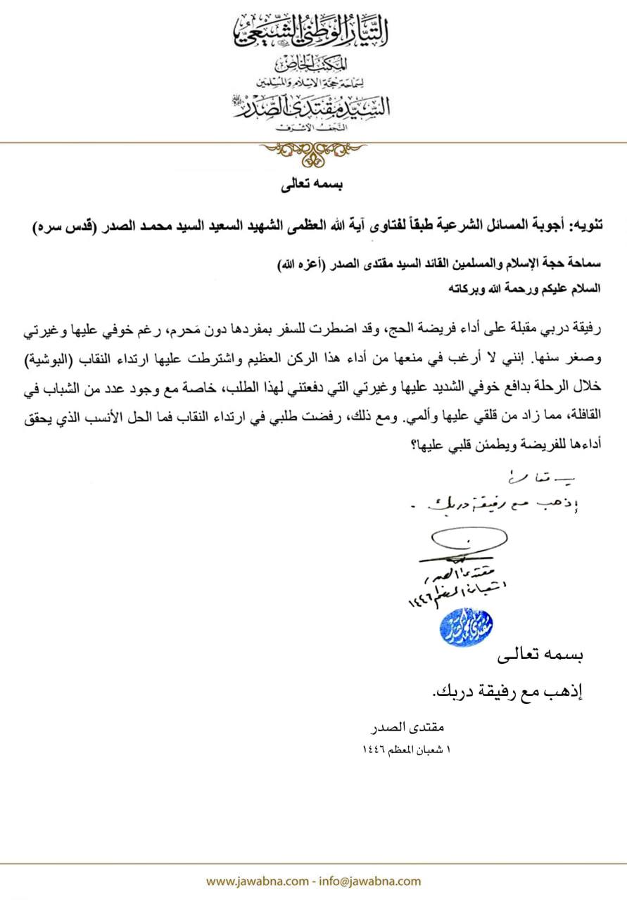 سماحة القائد السيد مقتدى الصدر (أعزه الله) يجيب على سؤال قدم لسماحته حول اشتراط ارتداء النقاب على الزوجة للذهاب للحج 26/04/2025 15:53:00 عدد القراءات : 370 المكتب الخاص/ النجف الأشرف