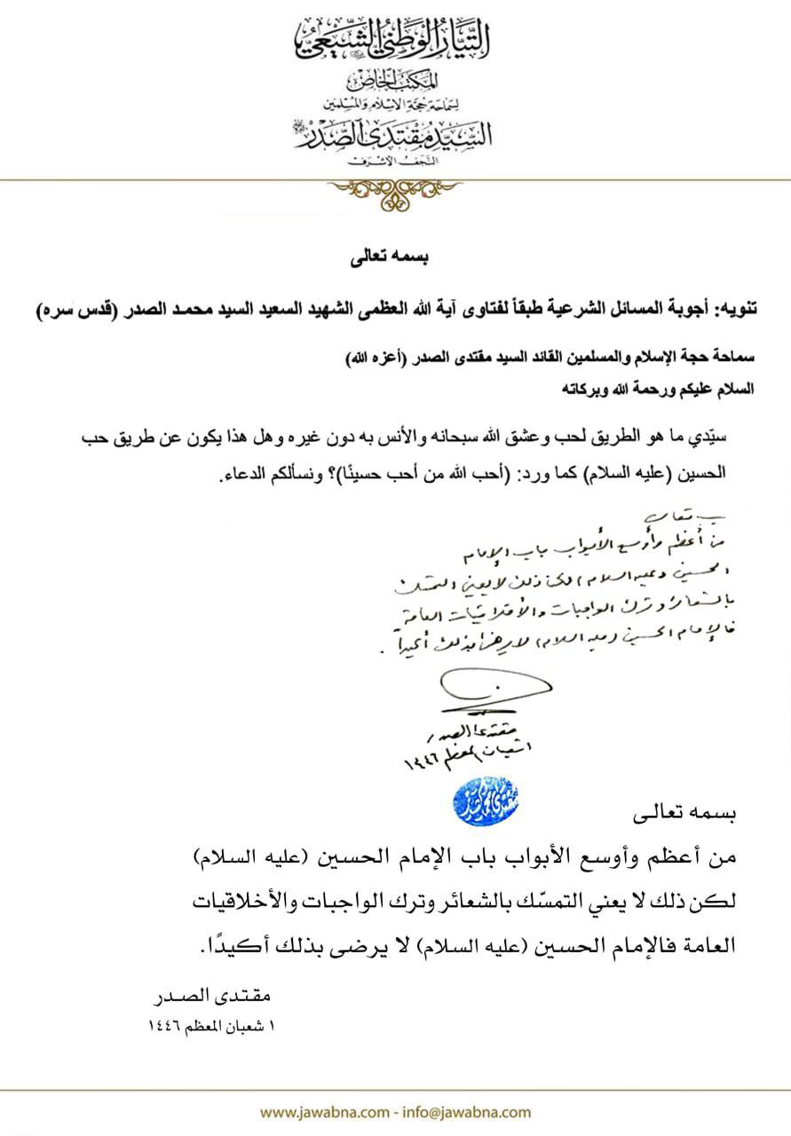 سماحة القائد السيد مقتدى الصدر (أعزه الله) يجيب على سؤال قدم لسماحته حول الطريق لحب وعشق الله سبحانه هل يكون عن طريق حب الحسين (ع)