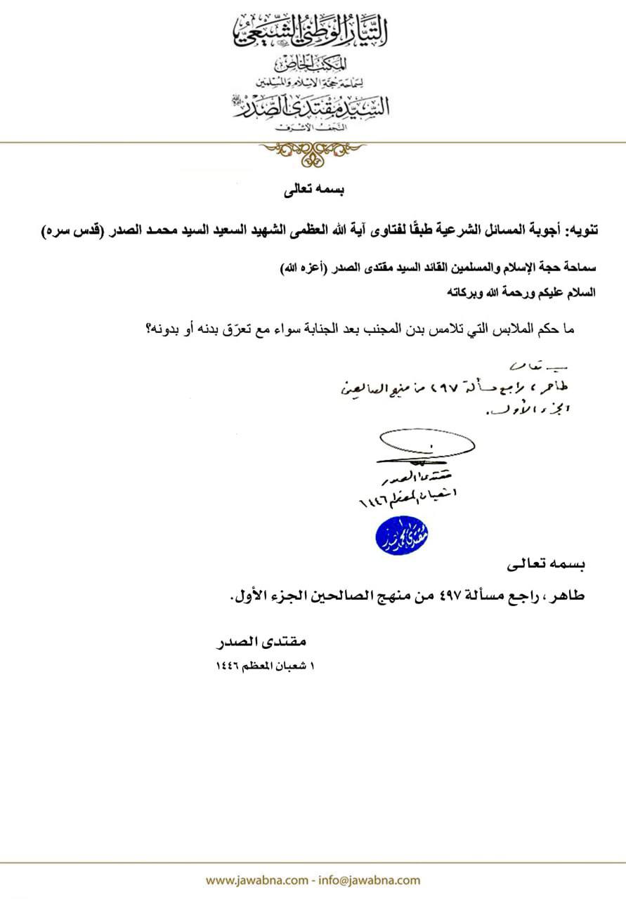 سماحة القائد السيد مقتدى الصدر (أعزه الله) يجيب على سؤال قدم لسماحته حول حكم الملابس التي تلامس بدن المجنب بعد الجنابة