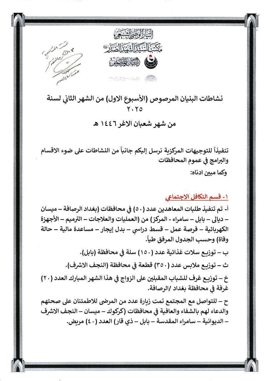 ضمن متابعته المستمرة اطلع سماحة القائد السيد مقتدى الصدر (أعزه الله) على آخر نشاطات مشروع البنيان المرصوص في عموم المحافظات، حيث إجاب سماحته (أعزه الله) على البريد الوارد والمقترحات المقدمة من قبل إدارة مشروع البنيان المرصوص.
