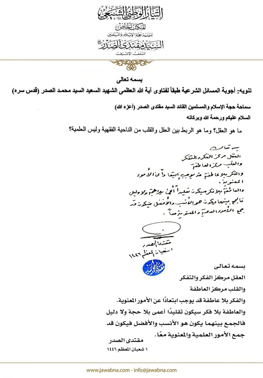 سماحة القائد السيد مقتدى الصدر (أعزه الله) يجيب على سؤال قدم لسماحته حول العقل والربط بينه وبين القلب من الناحية الفقهية