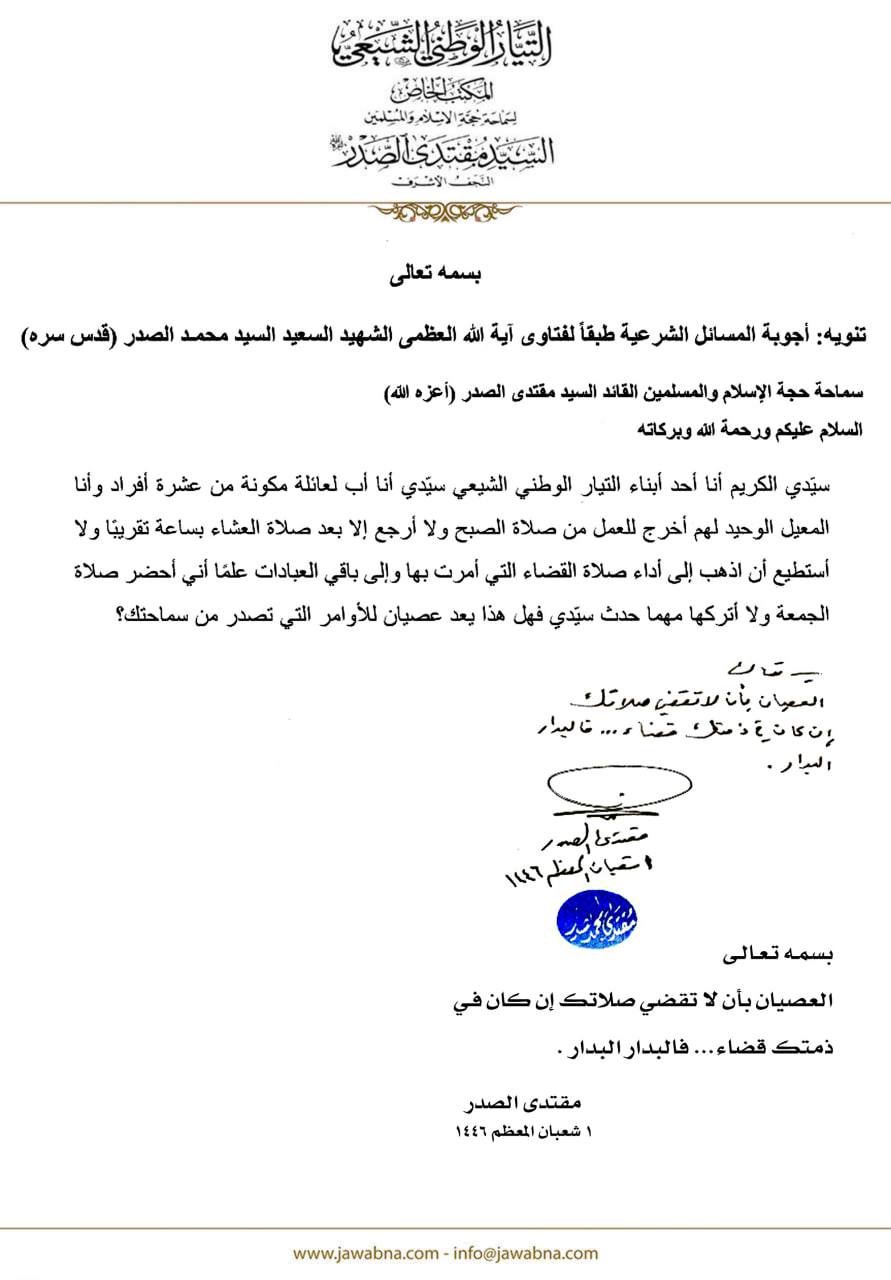 سماحة القائد السيد مقتدى الصدر (أعزه الله) يجيب على سؤال قدم لسماحته حول الذهاب الى أداء صلاة القضاء 27/04/2025 16:31:00 عدد القراءات : 173 المكتب الخاص/ النجف الأشرف