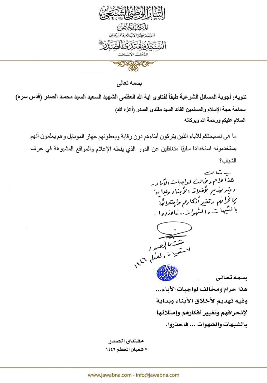 سماحة القائد السيد مقتدى الصدر (أعزه الله) يجيب على سؤال قدم لسماحته حول الآباء الذين يتركون أبنائهم دون رقابة مع جهاز الموبايل