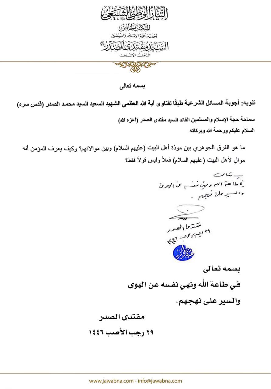سماحة القائد السيد مقتدى الصدر (أعزه الله) يجيب على سؤال قدم لسماحته حول الفرق الجوهري بين مودة أهل البيت (عليهم السلام) وبين مولاتهم