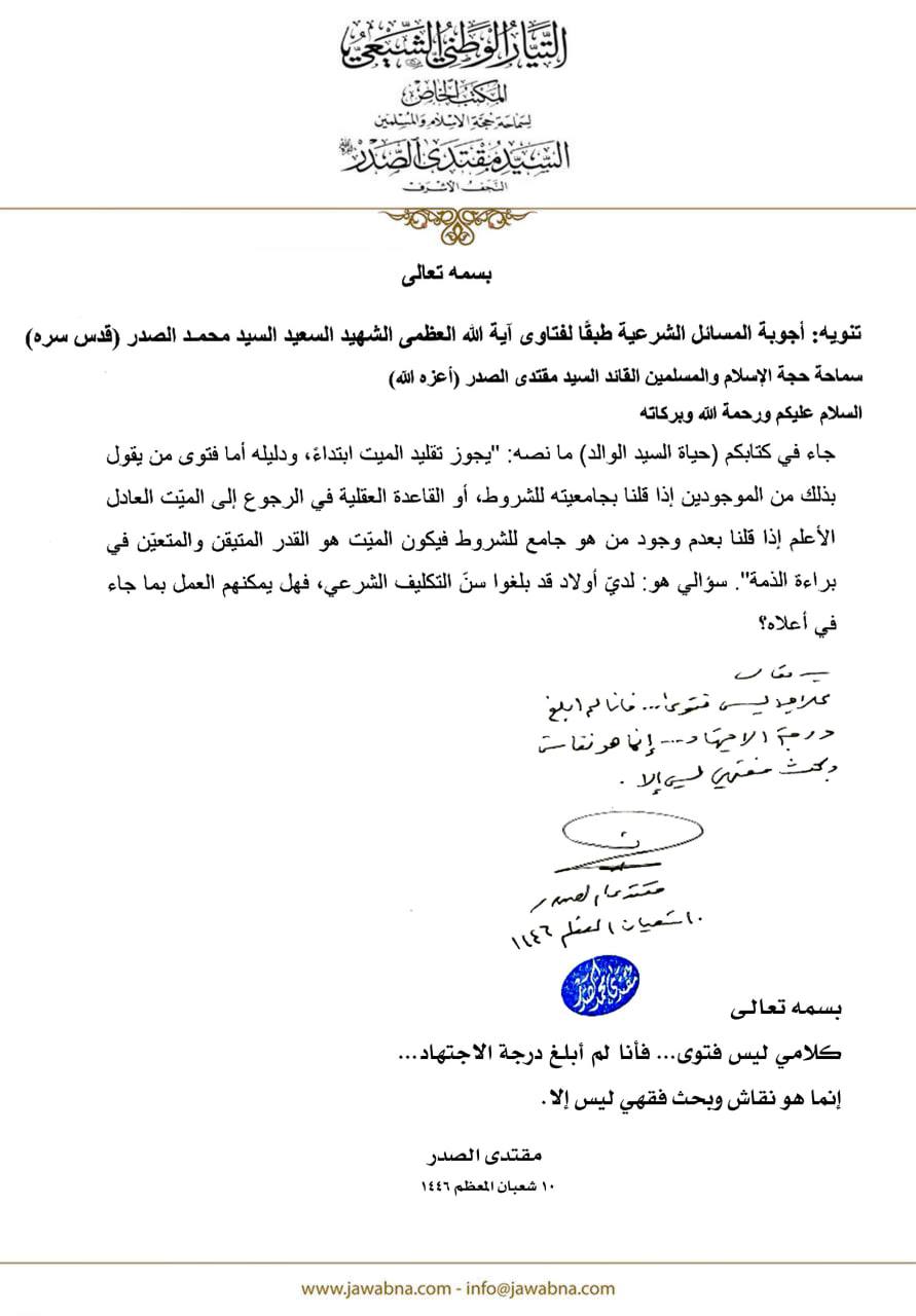 سماحة القائد السيد مقتدى الصدر (أعزه الله) يجيب على سؤال قدم لسماحته حول جواز تقليد الميت ابتداءً 28/04/2025 16:30:00 عدد القراءات : 139 المكتب الخاص/ النجف الأشرف