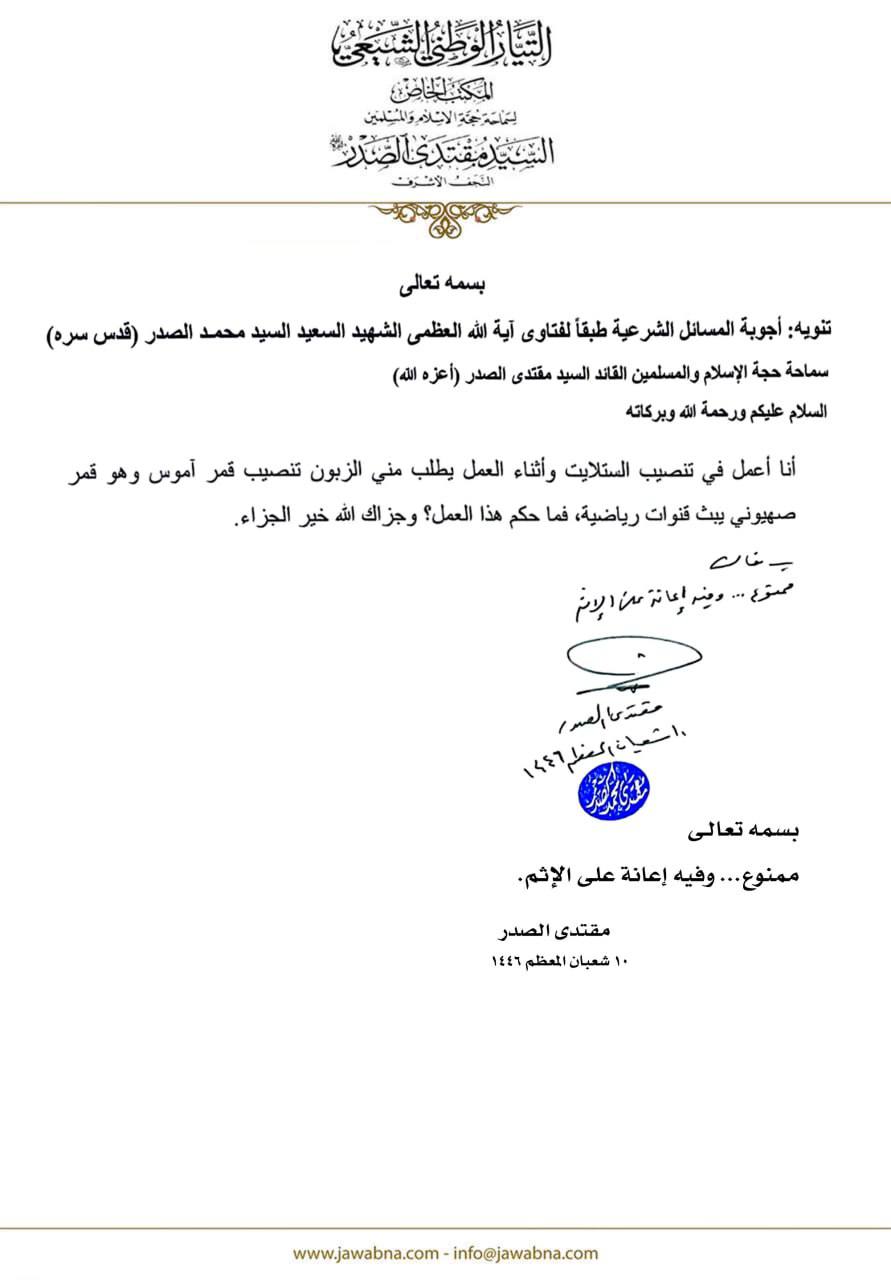 سماحة القائد السيد مقتدى الصدر (أعزه الله) يجيب على سؤال قدم لسماحته حول من يعمل في تنصيب الستلايت ويطلب منه تنصيب قمر آموس