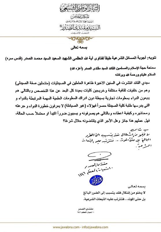 سماحة القائد السيد مقتدى الصدر (أعزه الله) يجيب على سؤال قدم لسماحته حول منتحلي صفة الصيدلي 28/04/2025 16:59:00 عدد القراءات : 566 المكتب الخاص/ النجف الأشرف