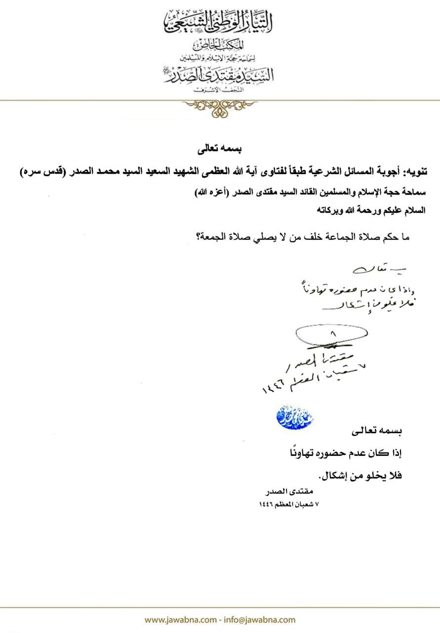 سماحة القائد السيد مقتدى الصدر (أعزه الله) يجيب على سؤال قدم لسماحته حول صلاة الجماعة خلف من لا يصلي الجمعة 29/04/2025 15:00:00 عدد القراءات : 267 المكتب الخاص/ النجف الأشرف