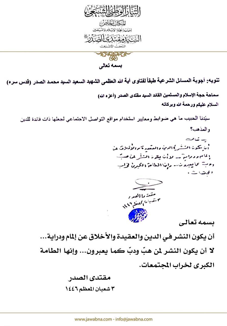 سماحة القائد السيد مقتدى الصدر (أعزه الله) يجيب على سؤال قدم لسماحته حول ضوابط ومعايير استخدام مواقع التواصل الاجتماعي
