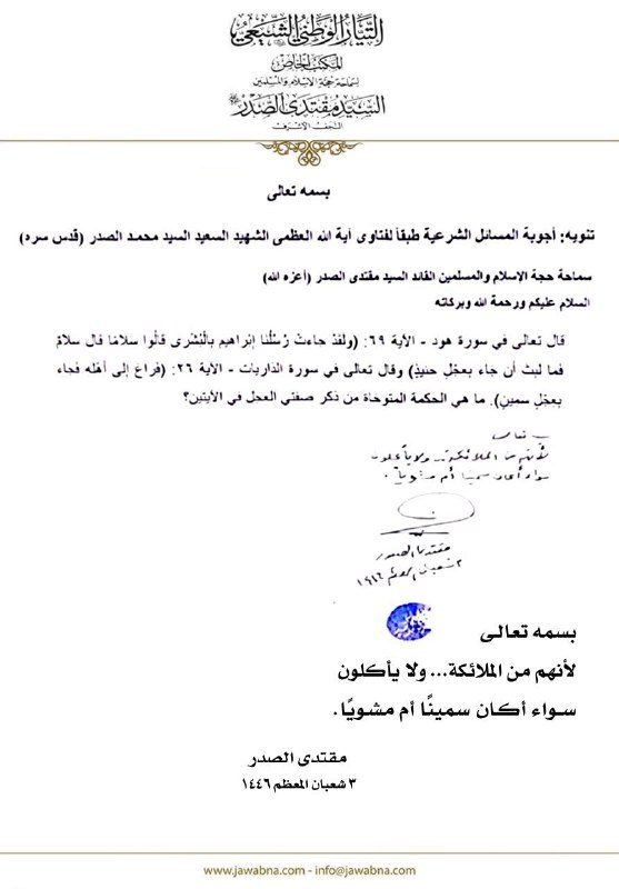 سماحة القائد السيد مقتدى الصدر (أعزه الله) يجيب على سؤال قدم لسماحته حول الحكمة المتوخاة من ذكر صفتي العجل في الآيتين 29/04/2025 15:08:00 عدد القراءات : 172 المكتب الخاص/ النجف الأشرف