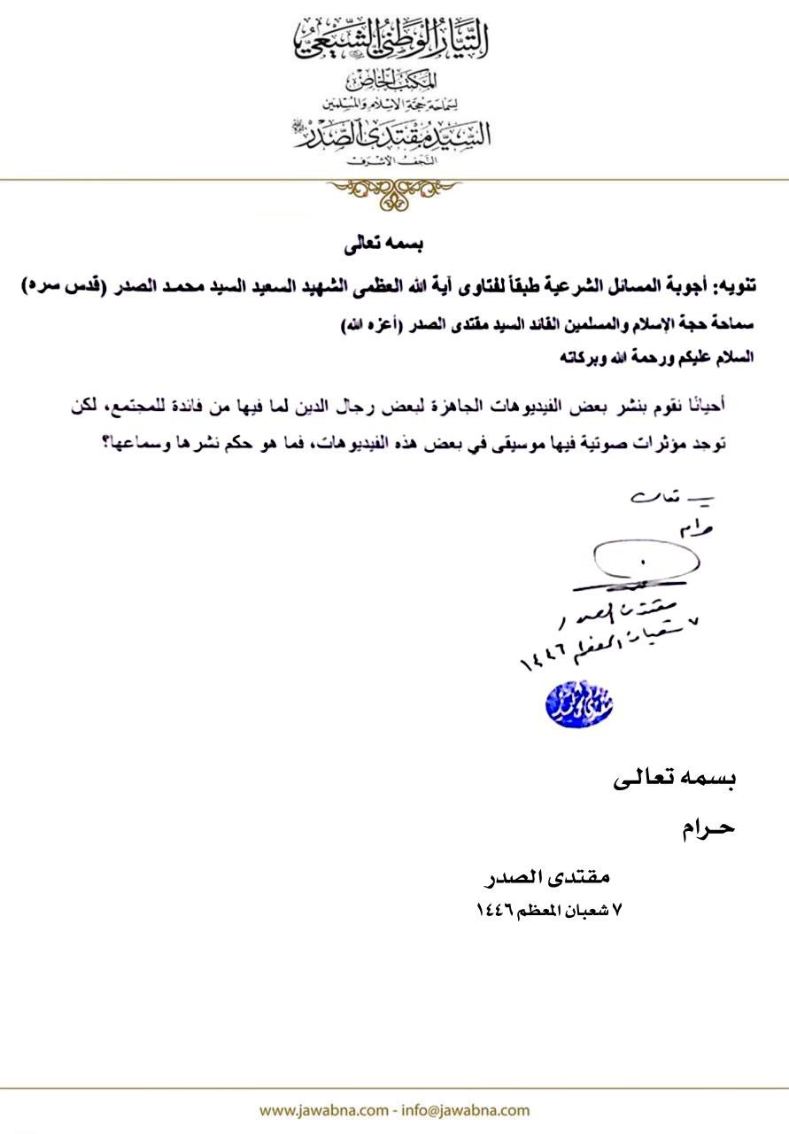 سماحة القائد السيد مقتدى الصدر (أعزه الله) يجيب على سؤال قدم لسماحته حول المؤثرات الصوتية 29/04/2025 15:10:00 عدد القراءات : 193 المكتب الخاص/ النجف الأشرف