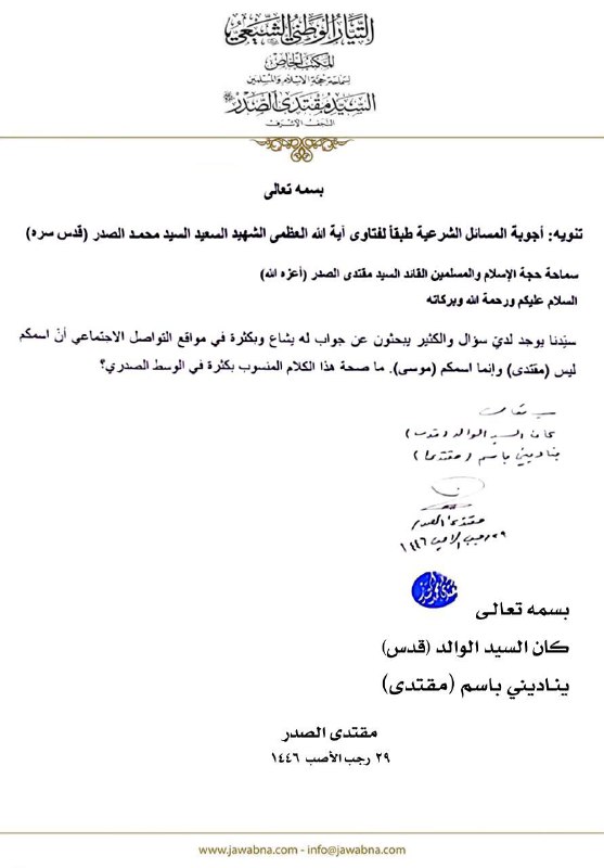 سماحة القائد السيد مقتدى الصدر (أعزه الله) يجيب على سؤال قدم لسماحته حول اسم سماحته (مقتدى) أم (موسى) 29/04/2025 15:12:00 عدد القراءات : 250 المكتب الخاص/ النجف الأشرف