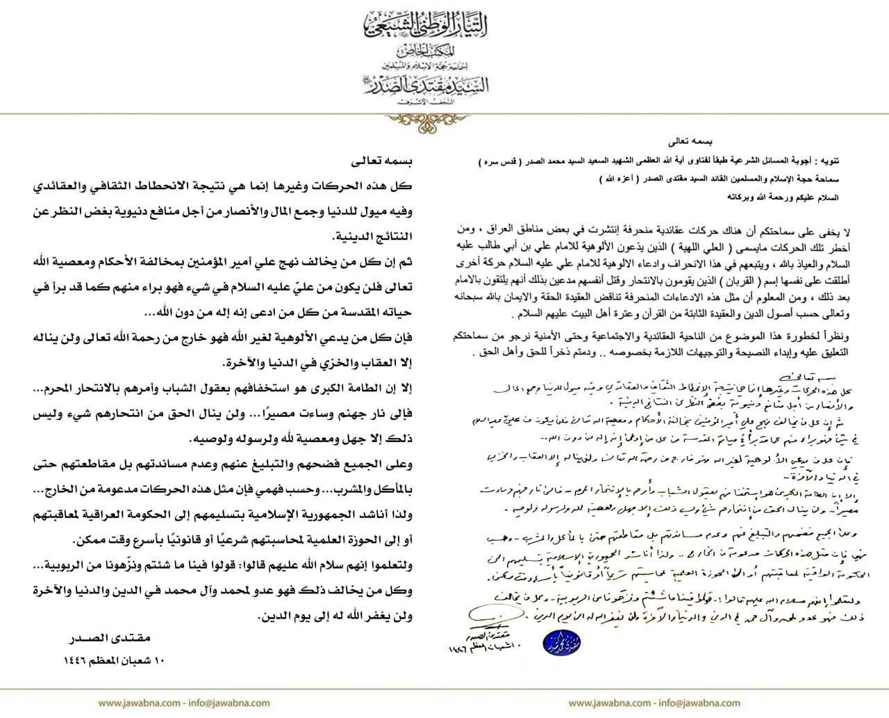 سماحة القائد السيد مقتدى الصدر (أعزه الله) يجيب على سؤال قدم لسماحته حول الحركات المنحرفة (العلي اللهية) 29/04/2025 15:13:00 عدد القراءات : 261 المكتب الخاص/ النجف الأشرف