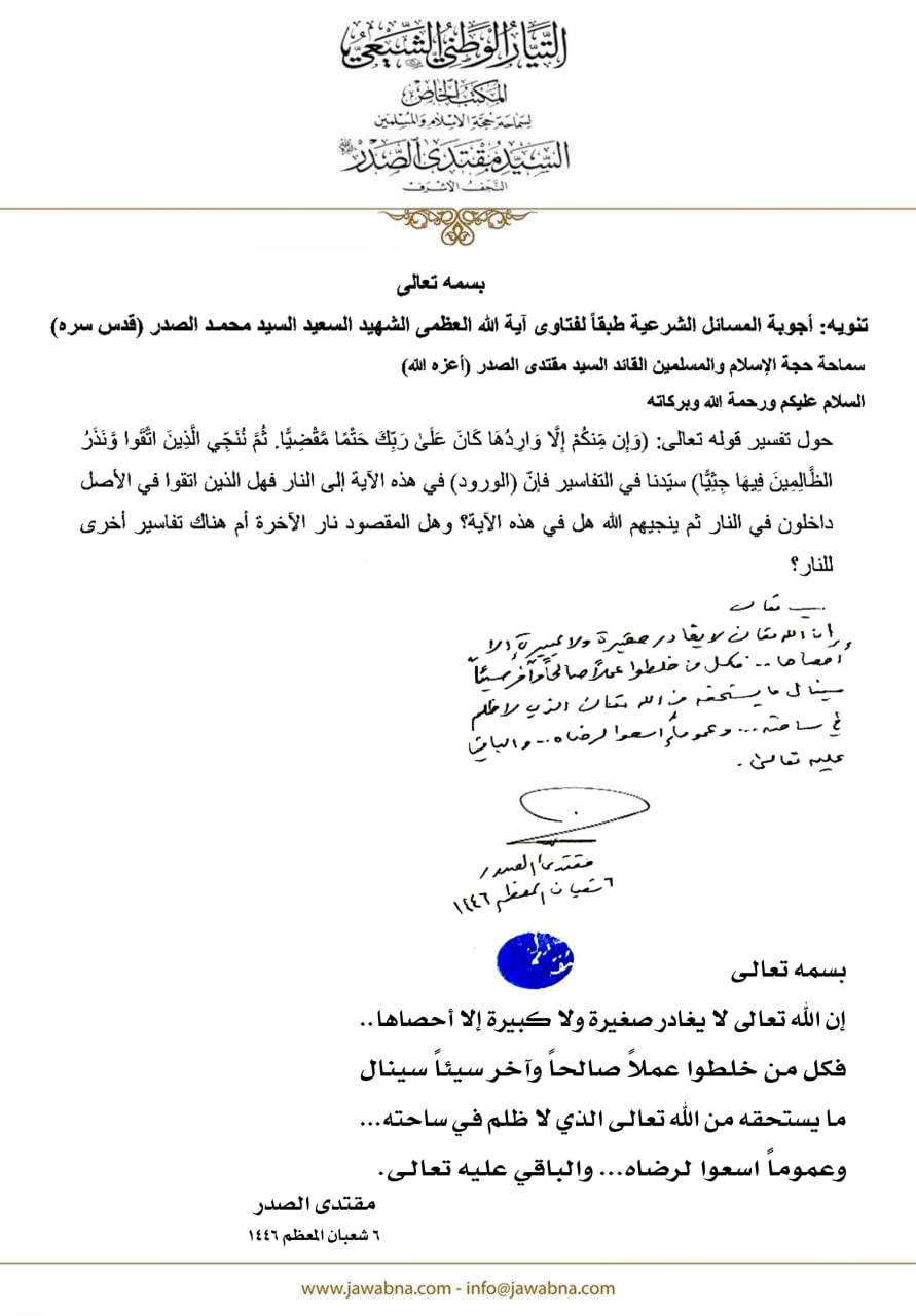 سماحة القائد السيد مقتدى الصدر (أعزه الله) يجيب على سؤال قدم لسماحته حول تفسير قواه تعالى (وإن منكم إلا واردها كان على ربك حتما مقضيا )