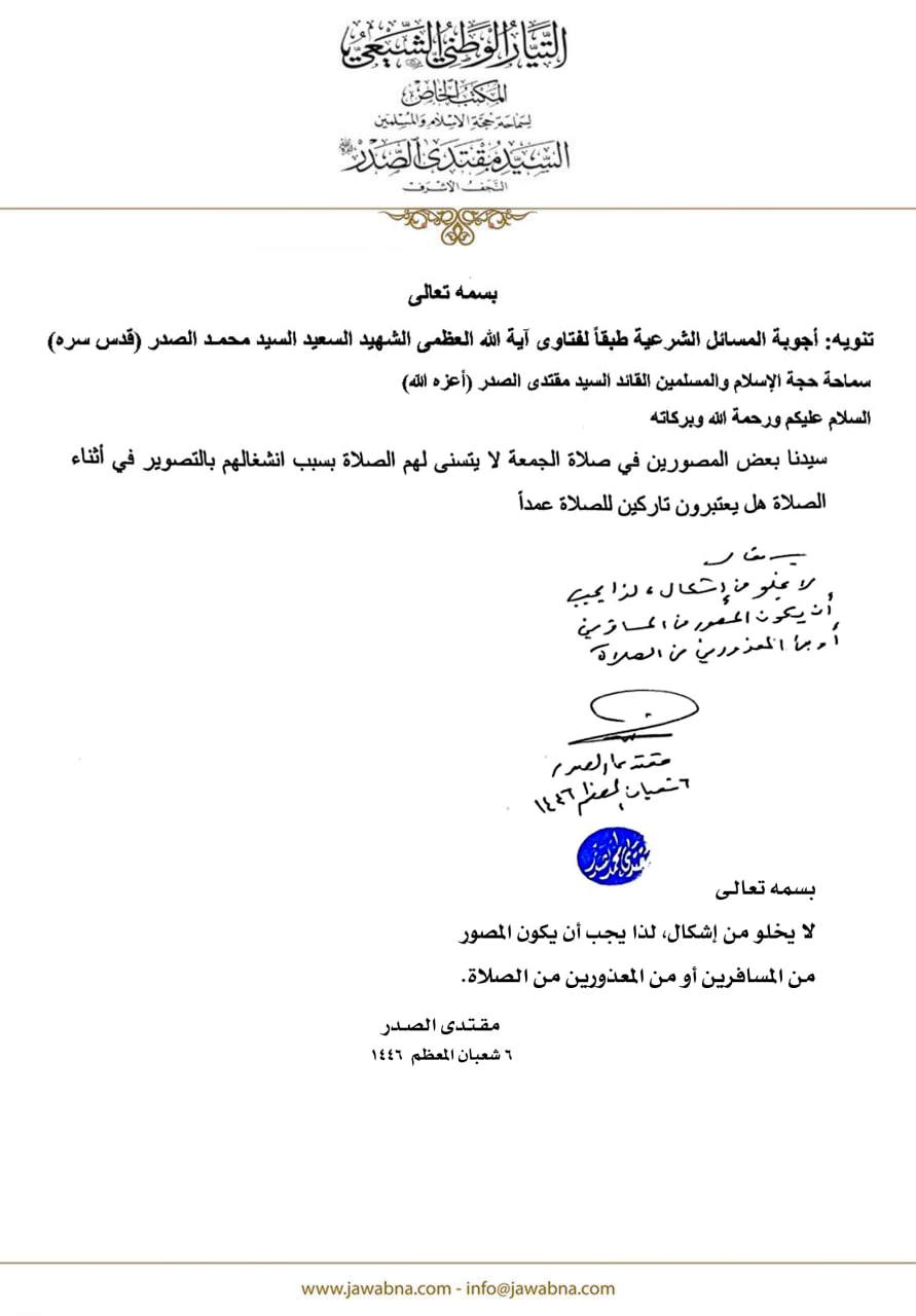 سماحة القائد السيد مقتدى الصدر (أعزه الله) يجيب على سؤال قدم لسماحته حول بعض المصورين في صلاة الجمعة 30/04/2025 15:10:00 عدد القراءات : 261 المكتب الخاص/ النجف الأشرف