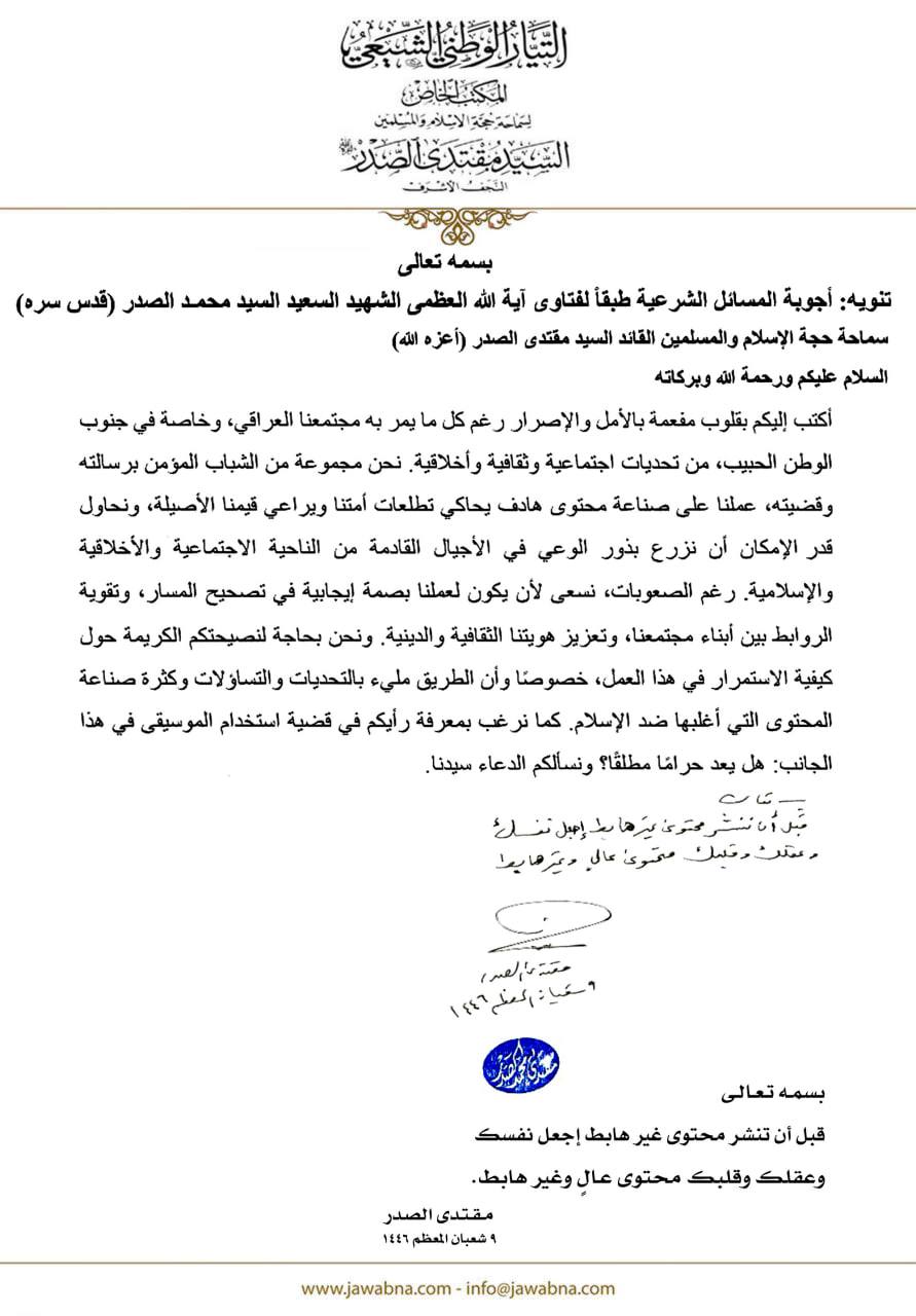 سماحة القائد السيد مقتدى الصدر (أعزه الله) يجيب على سؤال قدم لسماحته حول نشر محتوى هادف على مواقع التواصل الاجتماعي 30/04/2025 15:38:00 عدد القراءات : 527 المكتب الخاص/ النجف الأشرف