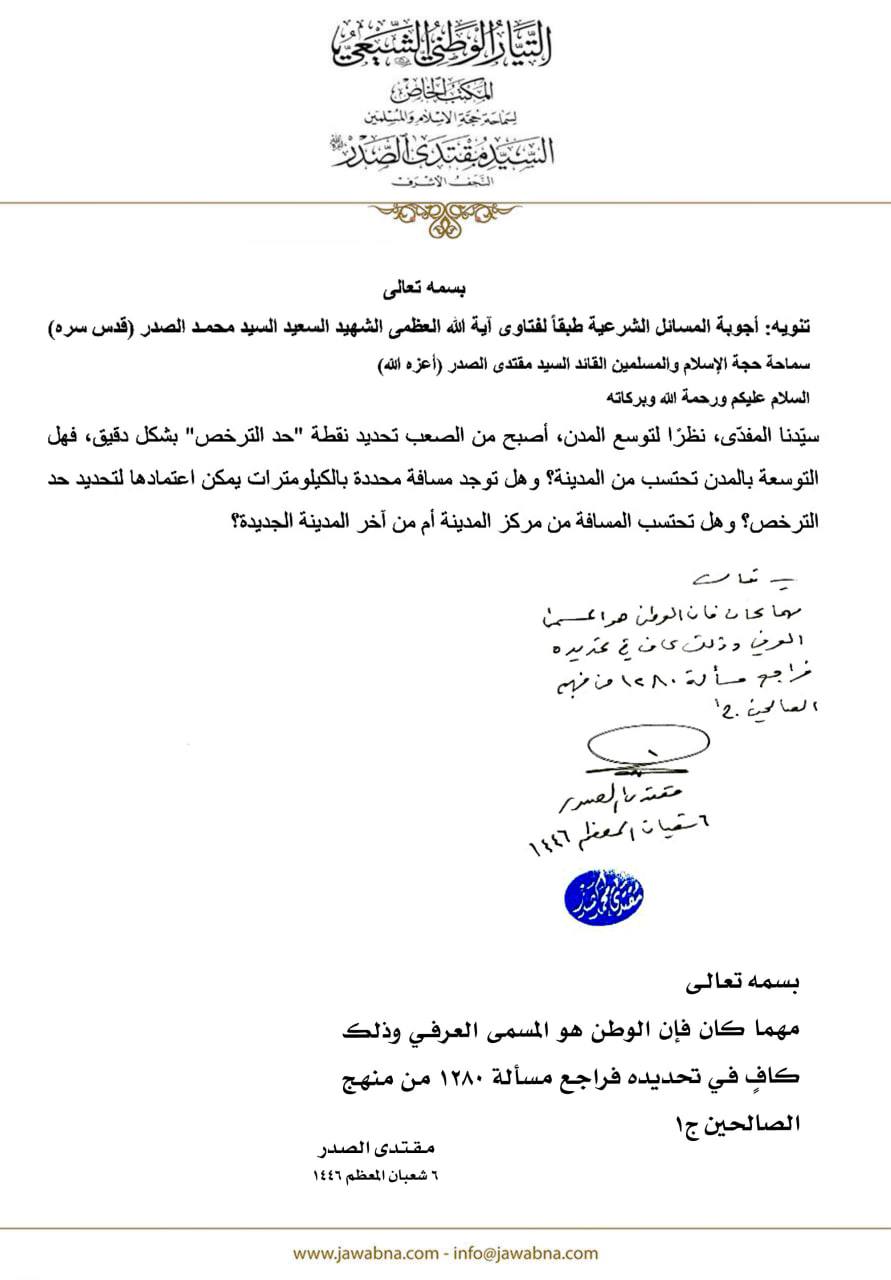 سماحة القائد السيد مقتدى الصدر (أعزه الله) يجيب على سؤال قدم لسماحته حول حكم حد الترخص والتوسعة في المدن 01/05/2025 15:36:00 عدد القراءات : 194 المكتب الخاص/ النجف الأشرف