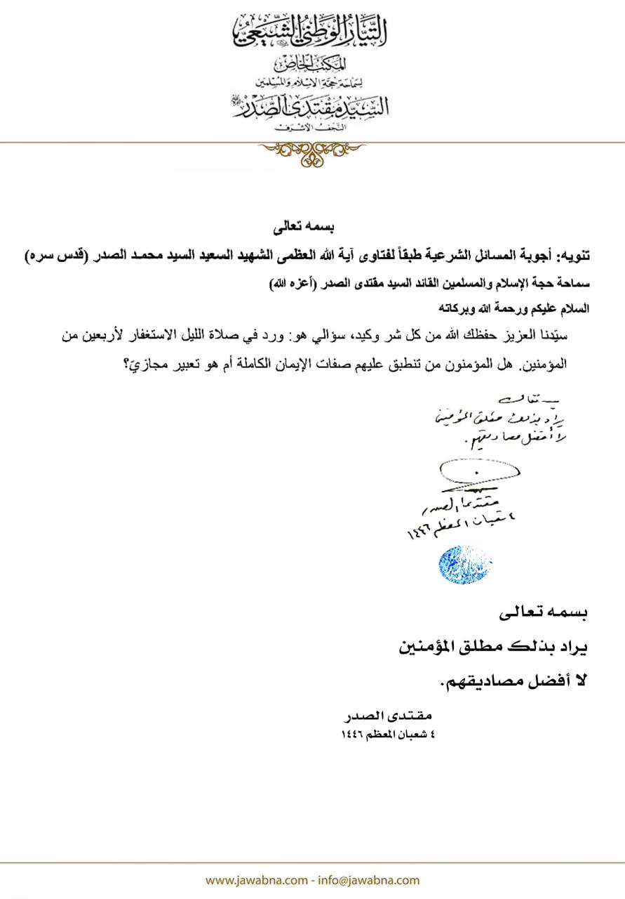 سماحة القائد السيد مقتدى الصدر (أعزه الله) يجيب على سؤال قدم لسماحته حول الاستغفار في صلاة الليل لأربعين مؤمن 01/05/2025 15:43:00 عدد القراءات : 168 المكتب الخاص/ النجف الأشرف