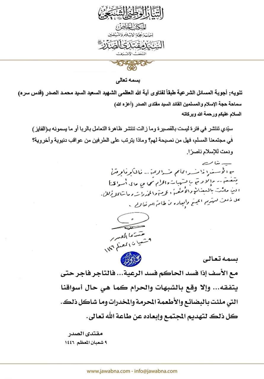 سماحة القائد السيد مقتدى الصدر (أعزه الله) يجيب على سؤال قدم لسماحته حول ظاهرة التعامل بالربا 01/05/2025 15:45:00 عدد القراءات : 261 المكتب الخاص/ النجف الأشرف