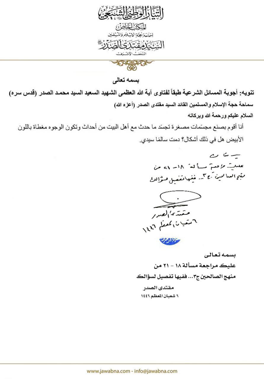 سماحة القائد السيد مقتدى الصدر (أعزه الله) يجيب على سؤال قدم لسماحته حول صنع مجسمات تجسد ما حدث مع أهل البيت من أحداث 01/05/2025 15:46:00 عدد القراءات : 179 المكتب الخاص/ النجف الأشرف