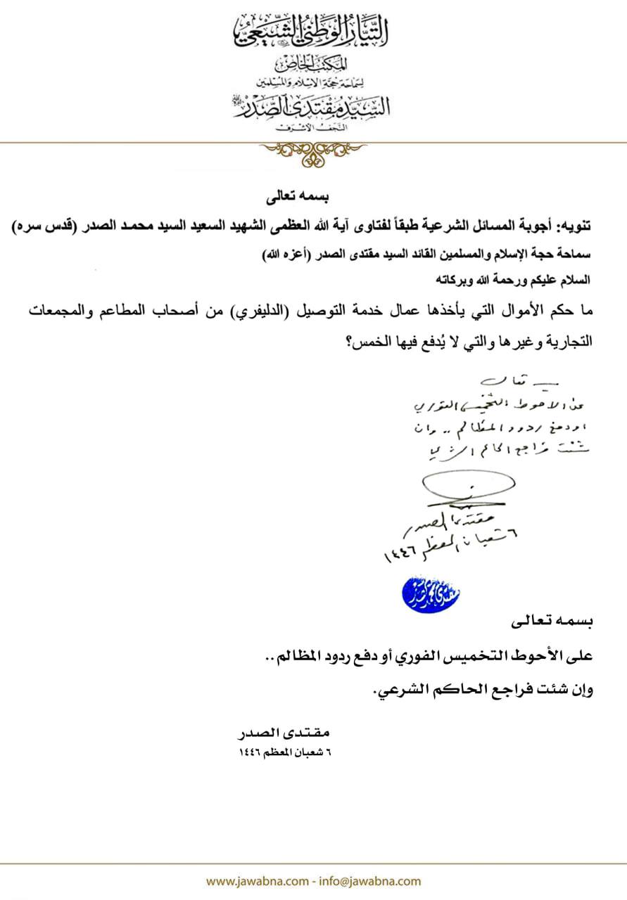 سماحة القائد السيد مقتدى الصدر (أعزه الله) يجيب على سؤال قدم لسماحته حول الأموال التي يأخذها عمال خدمة التوصيل (الدلفيري)
