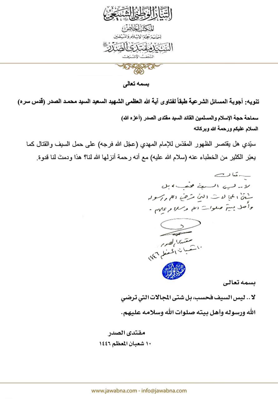 سماحة القائد السيد مقتدى الصدر (أعزه الله) يجيب على سؤال قدم لسماحته حول هل يقتصر الظهور المقدس للامام المهدي (عج) على حمل السيف والقتال