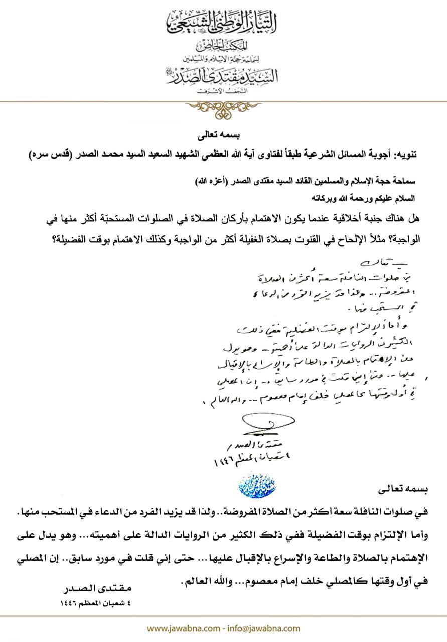 سماحة القائد السيد مقتدى الصدر (أعزه الله) يجيب على سؤال قدم لسماحته حول الاهتمام بأركان الصلاة في الصلوات المستحبة أكثر منها في الواجبة