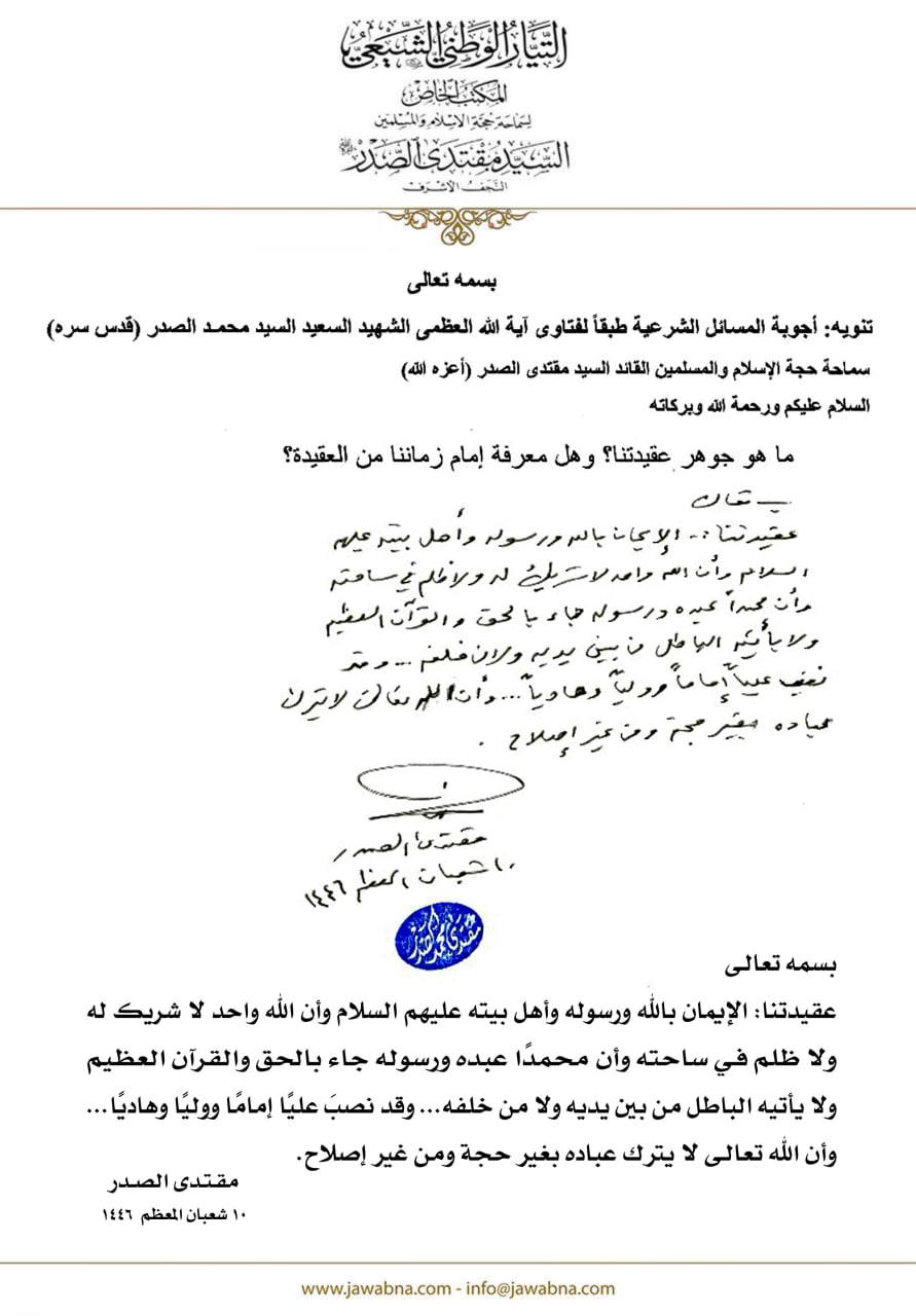 سماحة القائد السيد مقتدى الصدر (أعزه الله) يجيب على سؤال قدم لسماحته حول جوهر عقيدتنا وهل معرفة إمام زماننا من العقيدة