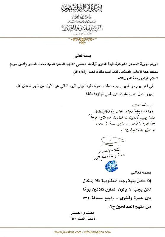 سماحة القائد السيد مقتدى الصدر (أعزه الله) يجيب على سؤال قدم لسماحته حول أداء العمرة في آخر يوم في شهر رجب والعمرة الثانية في أول يوم من شعبان