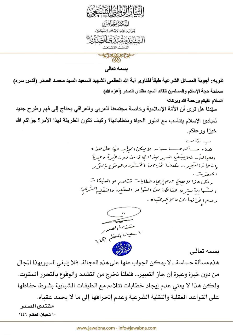 سماحة القائد السيد مقتدى الصدر (أعزه الله) يجيب على سؤال قدم لسماحته حول طرح جديد لمبادىء الإسلام يتناسب مع تطور الحياة ومتطلباتها