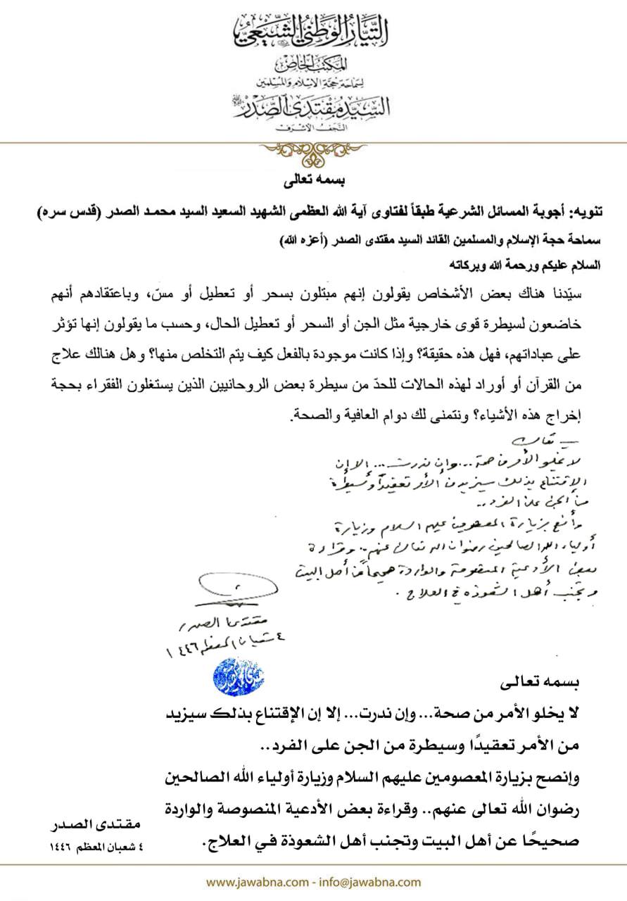سماحة القائد السيد مقتدى الصدر (أعزه الله) يجيب على سؤال قدم لسماحته حول هل هناك علاج من القرآن أو اوراد للتخلص من الجن أو السحر