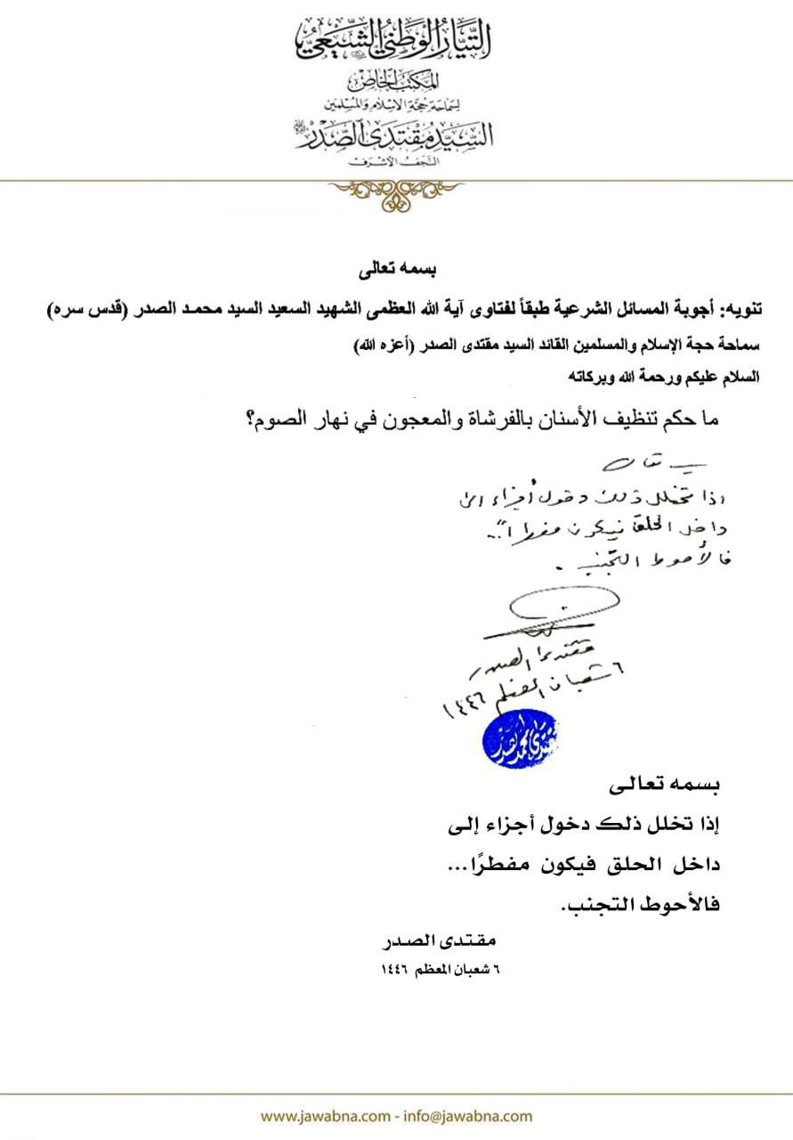 سماحة القائد السيد مقتدى الصدر (أعزه الله) يجيب على سؤال قدم لسماحته حول حكم تنظيف الأسنان بالفرشاة والمعجون في نهار الصوم