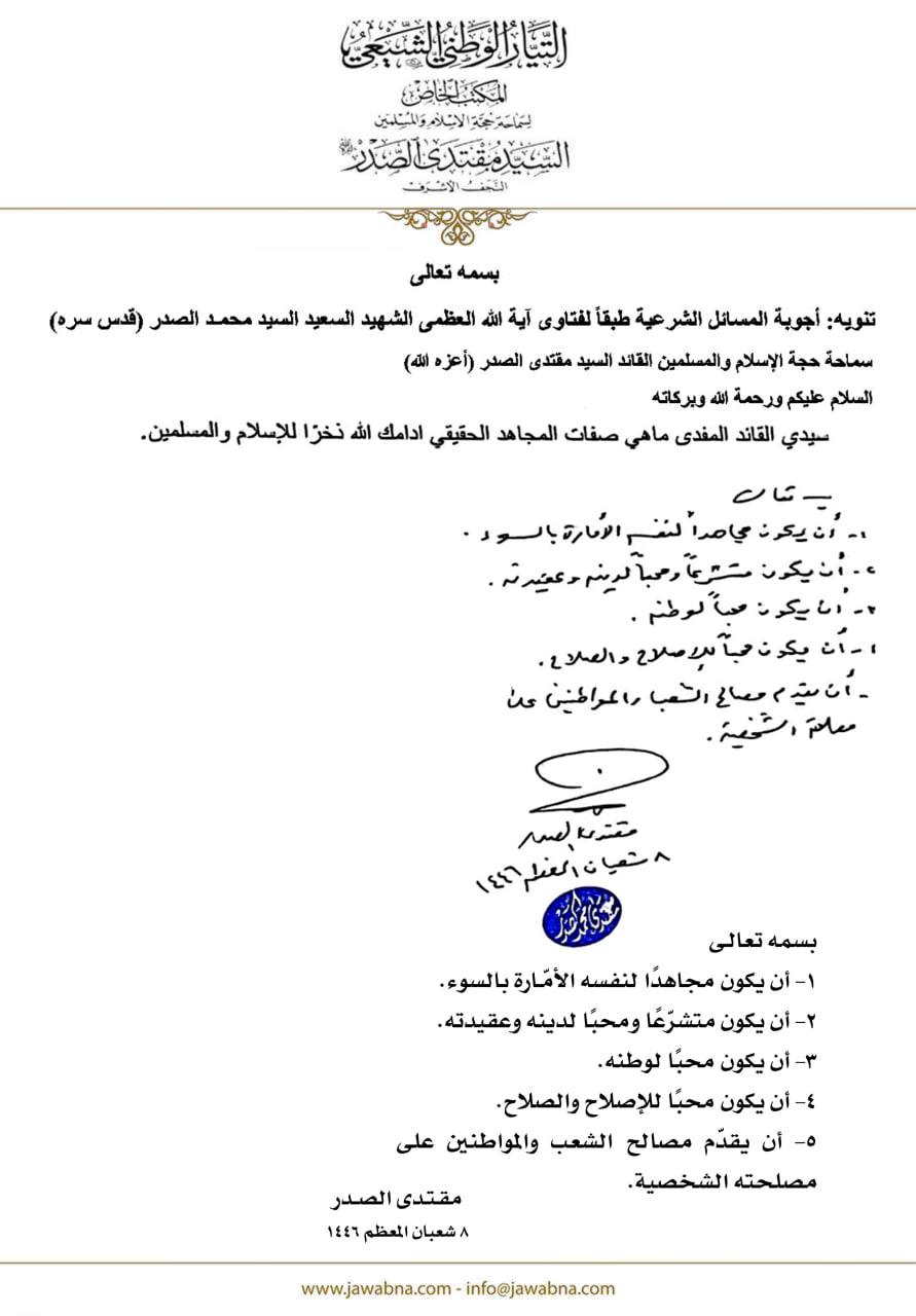 سماحة القائد السيد مقتدى الصدر (أعزه الله) يجيب على سؤال قدم لسماحته حول صفات المجاهد الحقيقي 02/05/2025 14:50:00 عدد القراءات : 277 المكتب الخاص/ النجف الأشرف
