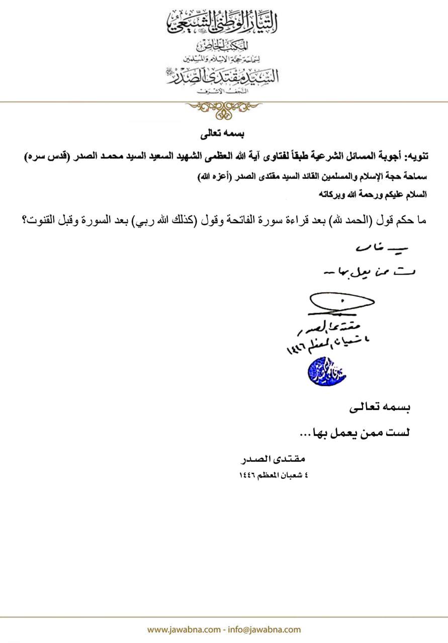 سماحة القائد السيد مقتدى الصدر (أعزه الله) يجيب على سؤال قدم لسماحته حول قول الحمد لله بعد قراءة سورة الفاتحة وقول (كذلك الله ربي) بعد السورة