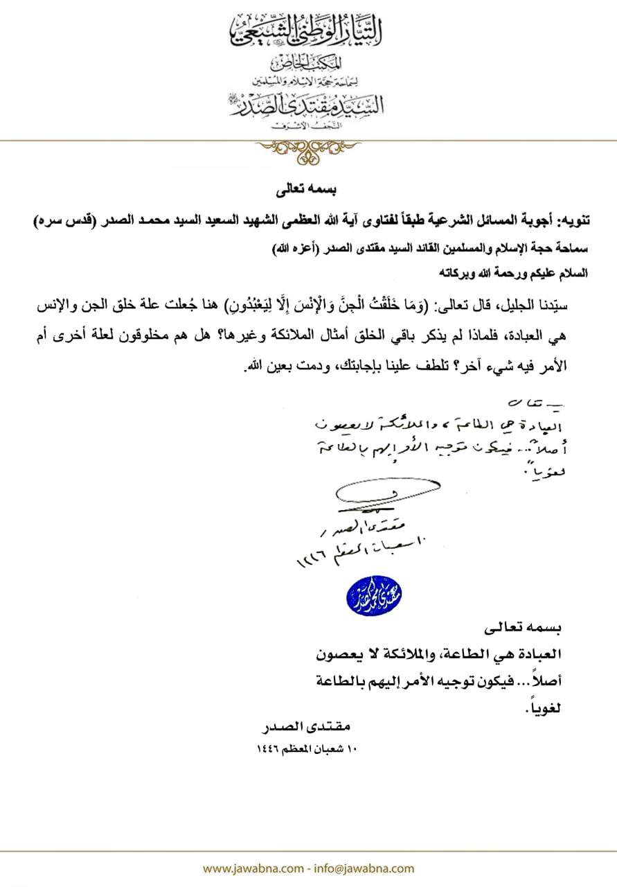 سماحة القائد السيد مقتدى الصدر (أعزه الله) يجيب على سؤال قدم لسماحته حول قوله تعالى (وما خلقت الجن والأنس إلا ليعبدون)