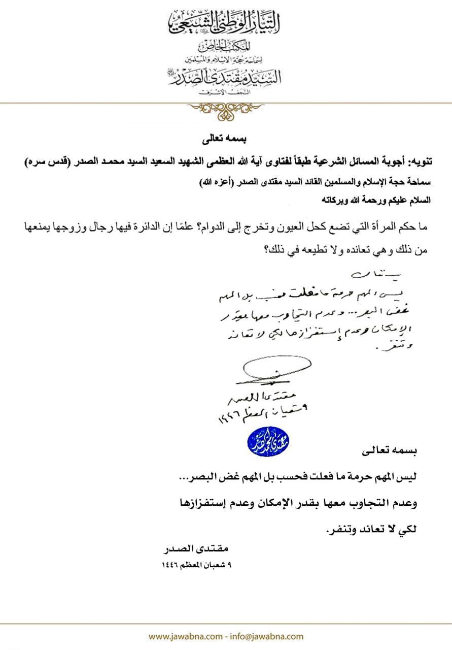 سماحة القائد السيد مقتدى الصدر (أعزه الله) يجيب على سؤال قدم لسماحته حول حكم وضع الكحل للعيون للمرأة وتخرج للدوام 03/05/2025 14:59:00 عدد القراءات : 179 المكتب الخاص/ النجف الأشرف