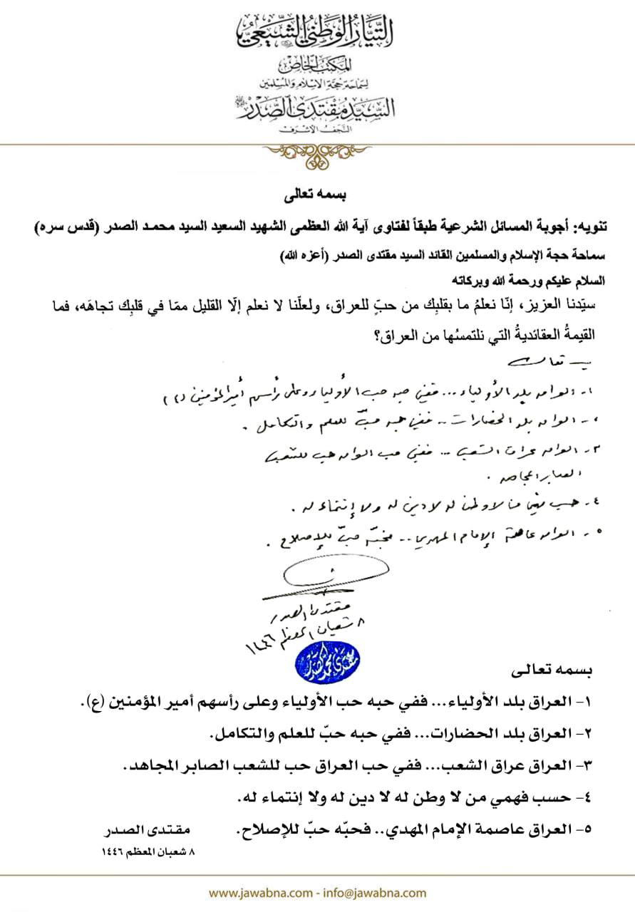 سماحة القائد السيد مقتدى الصدر (أعزه الله) يجيب على سؤال قدم لسماحته حول القيمة العقائدية التي نلتمسها من العراق 03/05/2025 15:05:00 عدد القراءات : 185 المكتب الخاص/ النجف الأشرف