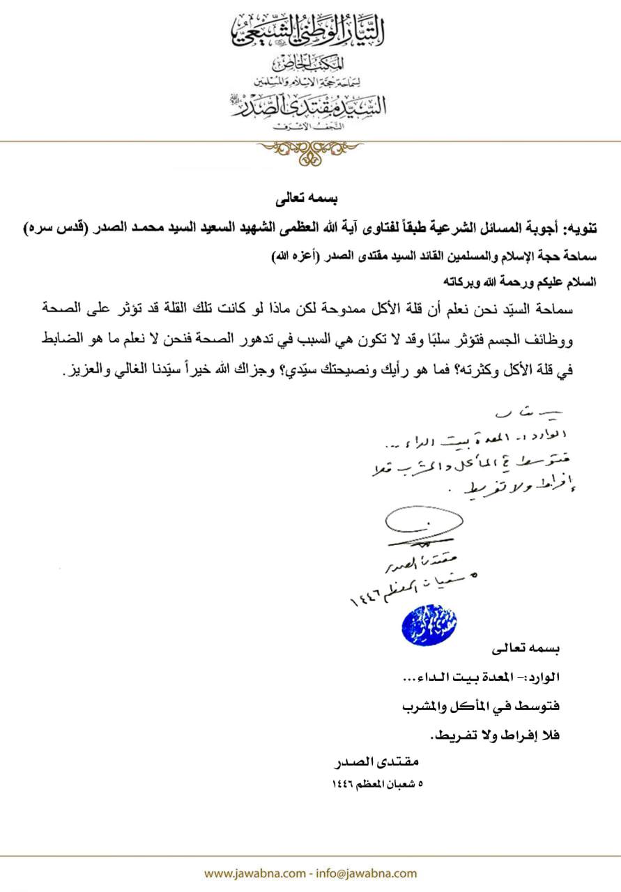 سماحة القائد السيد مقتدى الصدر (أعزه الله) يجيب على سؤال قدم لسماحته حول الضابط في قلة الأكل وكثرته 03/05/2025 15:06:00 عدد القراءات : 278 المكتب الخاص/ النجف الأشرف